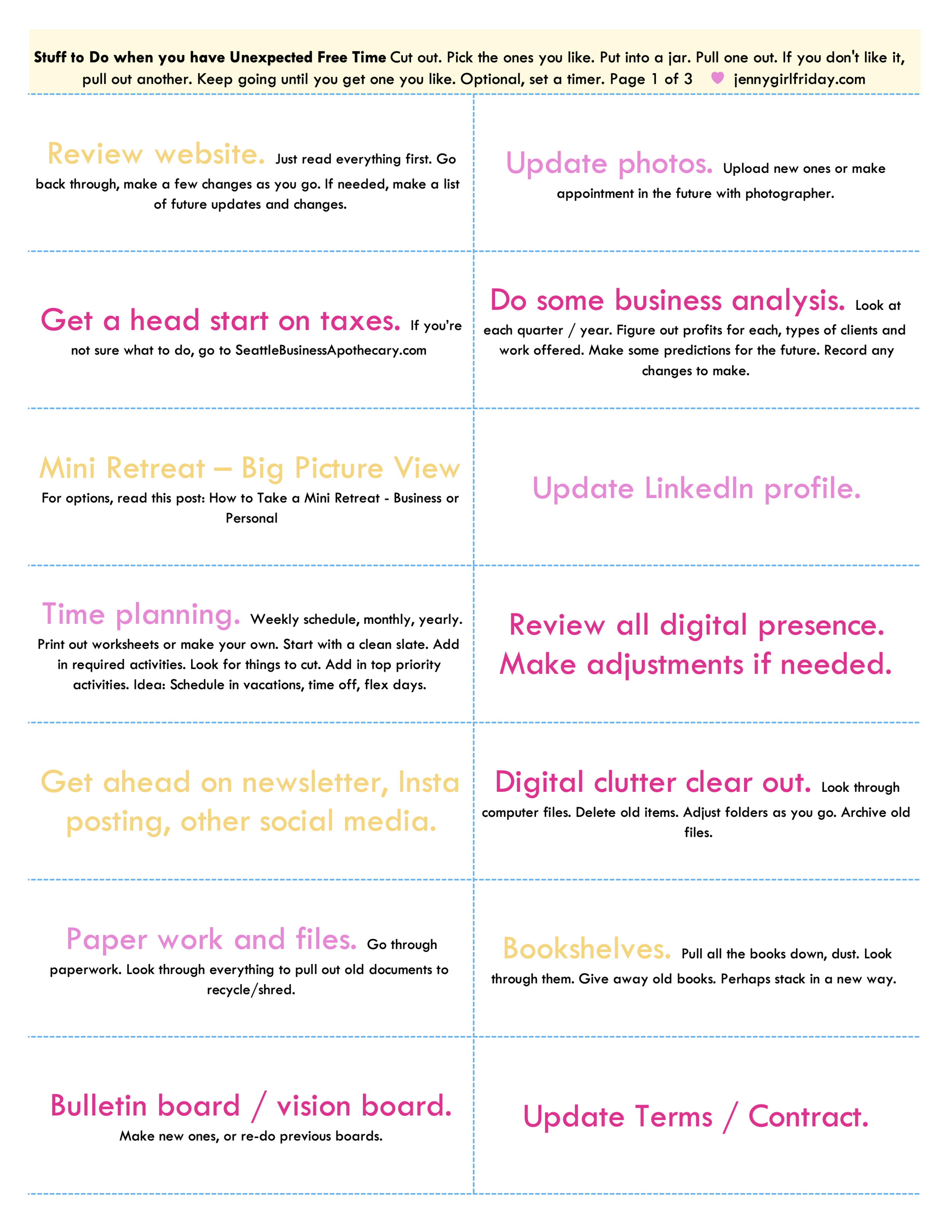 Have some unexpected Free Time? Want to get something done on your business, but not sure what to do? No problem! Read on to see a Master List of ways to work on your business, plus some strategies below.